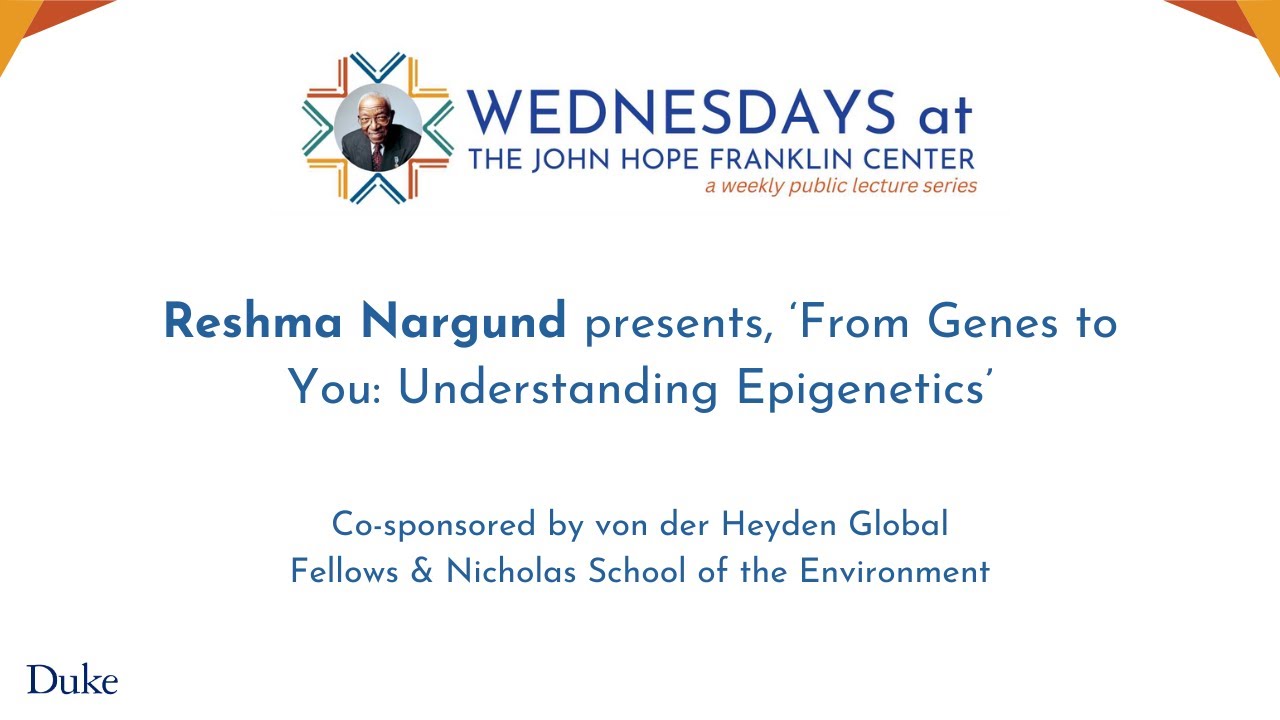 Reshma Nargund spoke at the John Hope Franklin Center’s ‘Wednesdays at the Center’ series with her lecture ‘From Genes to You: Understanding Epigenetics’. In this talk, she delved into the captivating world of genetic regulation beyond the traditional understanding of DNA. The event was co-sponsored by von der Heyden Global Fellows and Nicholas School of the Environment.